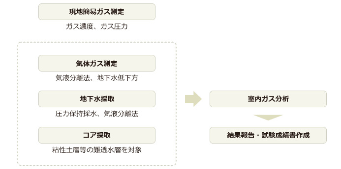 弊社はガス調査に必要な採取機器等も多数整備しておりますので、現地調査から報告まで一貫して対応が可能です。分析結果を現場へフィードバックし、採取方法等に問題がなかったか等の確認を実施しており、正確な結果をご提供いたしております。