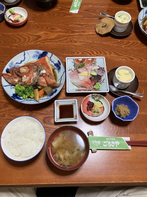 冬(もう初春ですけど)の伊豆といえば金目鯛の煮付けが食べたくなり,お昼ごはんは「キンメの煮付けと刺身定食」にしました。以前もここで食べたことあるですが,めちゃ美味しいのでリピートです。ちなみに予約しないと平日でも満席でした。