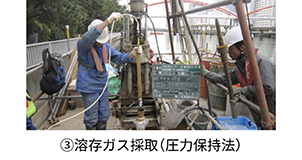 ボーリング孔を利用し、メタンガス等を主とした可燃性ガス、及び有害ガスについて調査します。